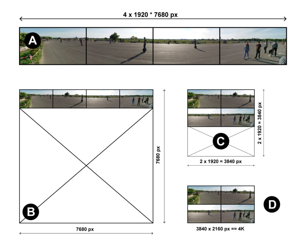 If you arrange them like in (C), you transport the exact same amount of pixels in a much smaller formfactor and if you need to send your four outpus through one cable, you can do it now as all you need is one 4K signal to squeeze in 4 x FullHD (D).